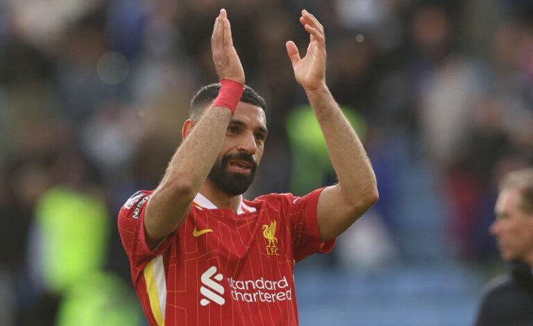 •Liverpool’s Egyptian striker #11 Mohamed Salah applauds on the pitch after the English Premier League football match between Leicester City and Liverpool at King Power Stadium in Leicester, central England on April 20, 2025. (Photo by Darren Staples / AFP)