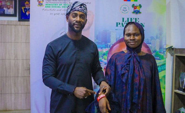 •Photo Caption: Lagos State Commissioner for Youth and Social Development, Mr. Mobolaji Ogunlende conferrs Mandy Kiss LASKADA ambassador. Credit: X/Mobolaji Ogunlende